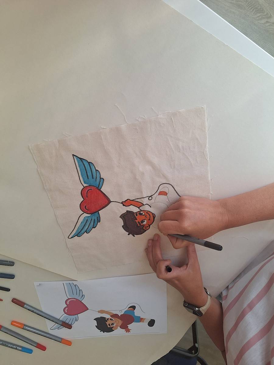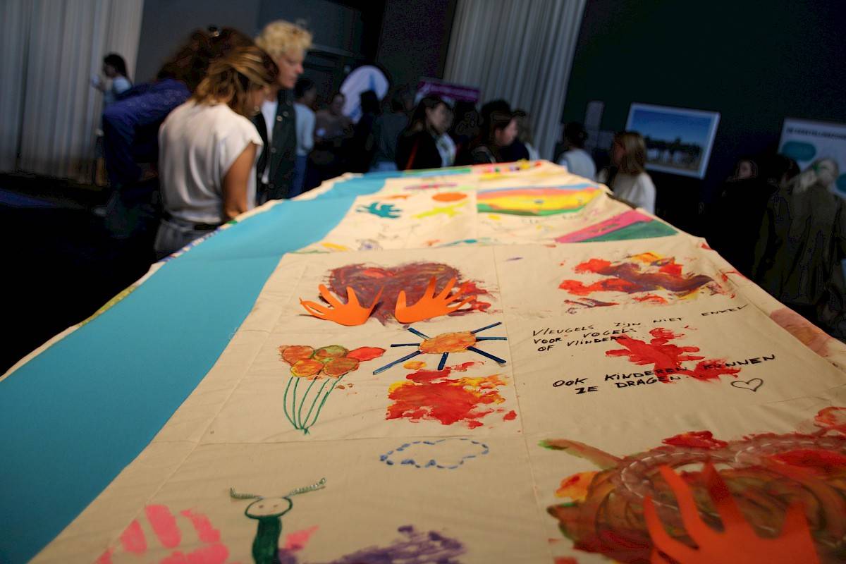 Iedere deelnemer kreeg een lapje stof van 30 x 30 cm. Niet veel, maar groot genoeg om een universum op kwijt te kunnen. Met naald en draad, verf, potlood of stift brachten ze hun eigen verhaal tot leven: een droom, een wens, een herinnering, iets dat kracht of hoop gaf. Iets dat vleugels schonk.